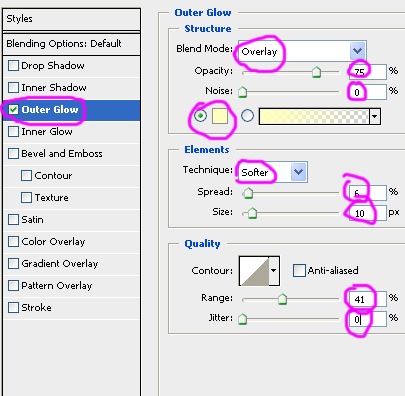 - pada layer 3 tersebut pilih Layer > Layer Style > Outer Glow, dan setting seperti gambar dibawah ini